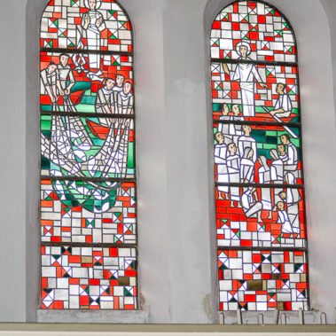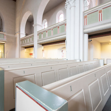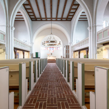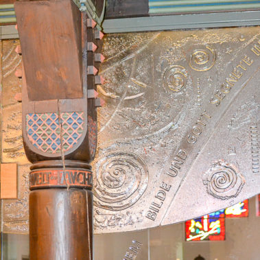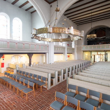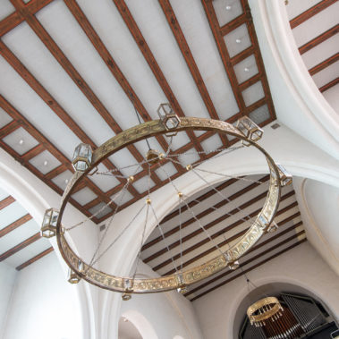 Die beiden Leuchter stammen aus der Anfangszeit der Kirche. Der vordere große Leuchter ist die Stiftung eines Westerländers „aus Dankbarkeit für die große Güte Gottes“ – übrigens nach einem langen, leidvollen Leben gegeben…