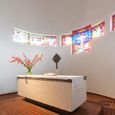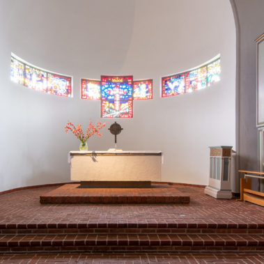 Die Fenster sind Arbeiten des Ahrensburger Glaskünstler Siegfried Assmann. Raumbeherrschend leuchtet das Mosaikband über dem Altar, das Passion und Ostergeschichte darstellt. Es durchbricht die Formgebung der Apsis – ganz so, wie das Geschehen um Jesus Christus die menschlichen Vorstellungen vom Heil Gottes durchbricht: zu Kunst gewordene Theologie der damaligen Jahre. Die Fenster in der Südseite des Kirchenschiffes zeigen Jesusgeschichten, die in der Nordseite illustrieren Gleichnisse des Predigers aus Nazareth.