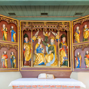 Der Altar ist der Blickfang für alle Besucher der Kirche. Er stellt die Krönung der Maria durch den auferstandenen Christus dar und wurde etwa um 1475 vermutlich in Lübecker Tradition hergestellt. Es ist nicht bekannt, auf welchen Wegen das Altarretabel nach Sylt kam. Wahrscheinlich stand das Kunstwerk schon in der alten Eidumer Kirche. Neben den Aposteln in den Flügeltüren sind zwei Bischofsfiguren eingebracht: links der Hl. Nikolaus, Namensgeber des Gotteshauses und der Gemeinde, rechts der Hl. Dionysius, einer der 14 katholischen Schutzheiligen. Viele Jahre nahm die lutherische Gemeinde keinen Anstoß an diesem katholischen Motiv. Aber als mit dem Aufstieg zum Seebad auch viele katholische Badegäste die Insel besuchten, sorgten strenge lutherische Pastoren dafür, dass der Altar 1892 mit einem Bild vom Seewandel des Petrus überdeckt wurde – bis 1925 blieb es dort… Das Retabel wurde im Laufe seiner langen Geschichte mehrfach farblich neu gestaltet. Eine aufwendige Restaurierung wurde 2018 abgeschlossen.
