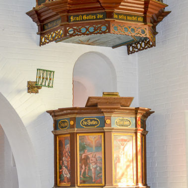 Die hölzerne Kanzel stammt aus dem Jahr 1751. Wer sie erbaut und bemalt hat, ist nicht bekannt. An ihrer Seite findet sich der Nachbau einer alten Sanduhr nach alten Originalteilen. Solche Uhren halfen seit dem 17. Jh. in vielen Kirchen, die Dauer der Predigt auf eine Stunde zu begrenzen.