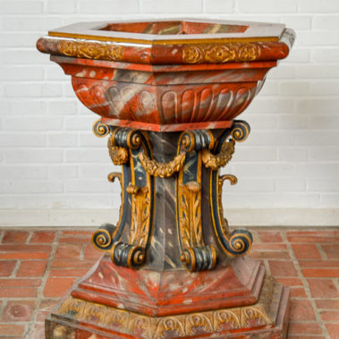 Die hölzerne Taufe mit Deckel ist eine Leihgabe der Gemeinde Neugalmsbüll bei Niebüll. Nachdem der romanische Taufstein 1908 in die neue Kirche versetzt wurde, kann seit 1988 wieder in St. Niels getauft werden.