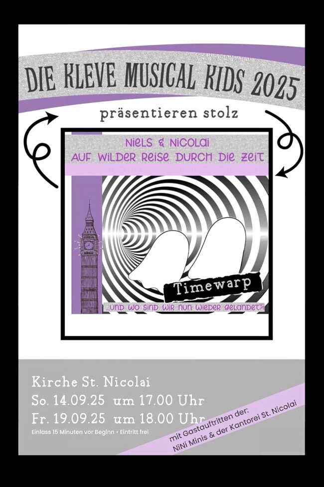 Am Sonntag, 14. September, präsentieren die diesjährigen Kleve Musical Kids stolz die Uraufführung von „Niels & Nicolai auf wilder Reise durch die Zeit!“ Mit Gastauftritten von den NiNi Minis und der Kantorei St. Nicolai. Der Beginn ist um 17.00 Uhr, Einlass startet zirka 15 Minuten vorher. Der Eintritt ist frei. Eine weitere Aufführung findet statt…